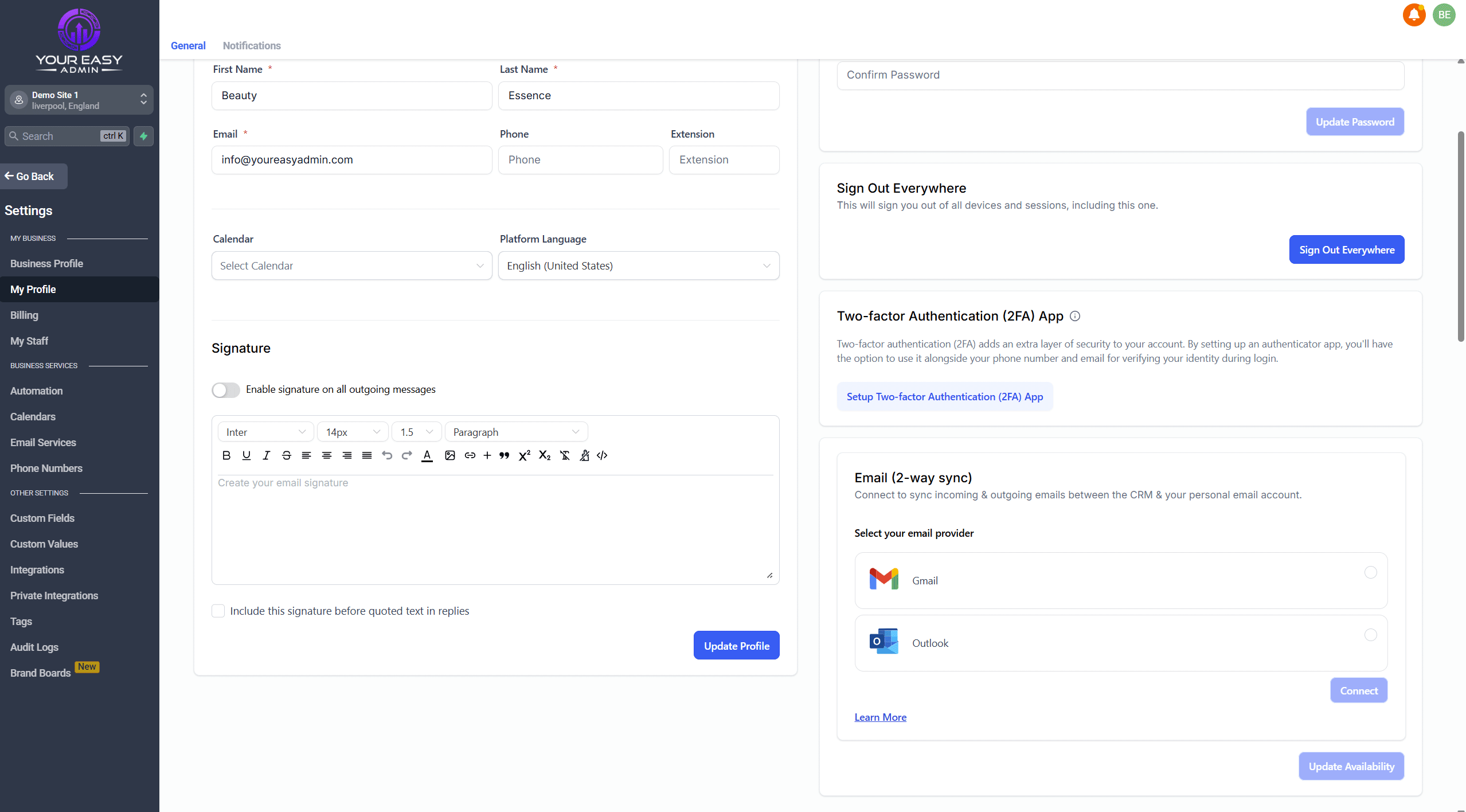 - Settings > My Profile > Email (2-Way-Sync)