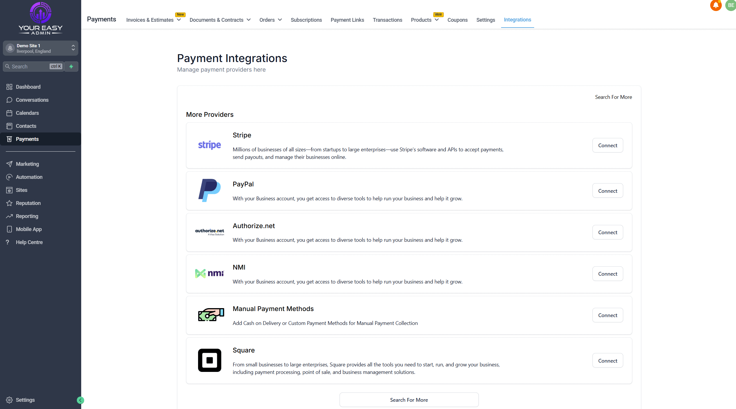 - Payments > Integrations > Pick a provider and connect to them. You will need to create an account.